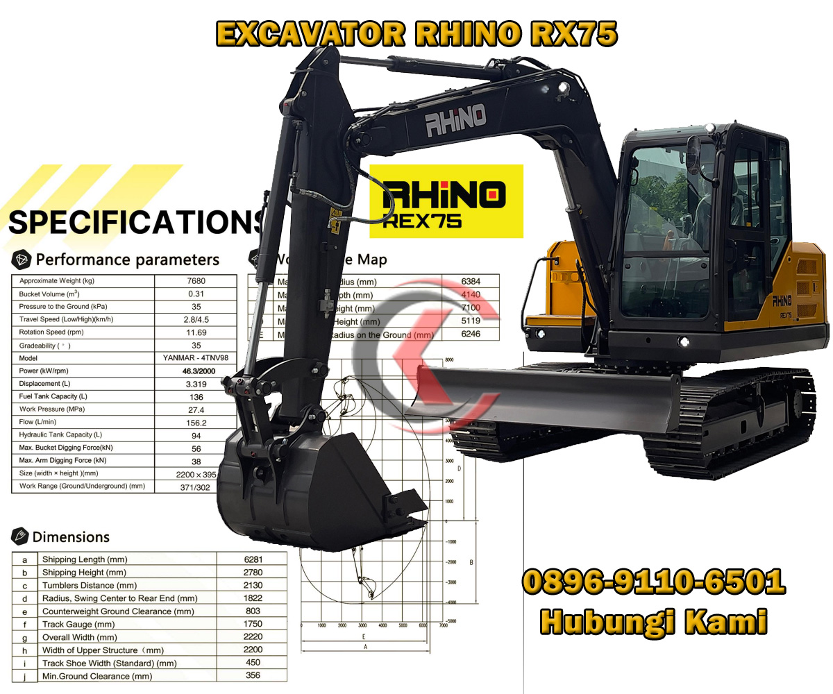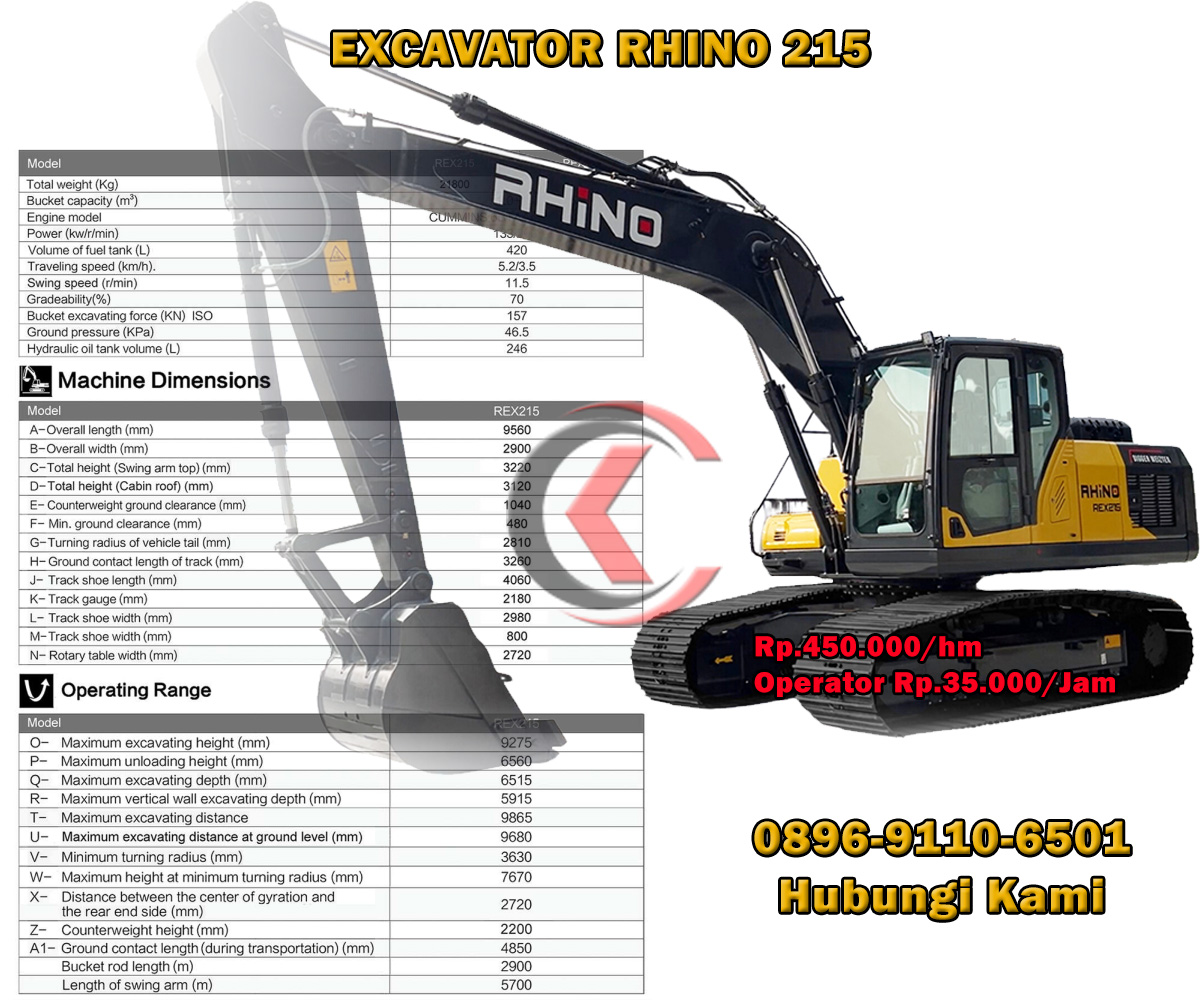 Excavator Rhino REX215 terkenal yang dikenal karena keandalan, daya tahan, dan efisiensinya dalam berbagai sektor konstruksi, sektor pertambangan, dan sektor kehutanan. Operating Weight : 7680 Kg, Bucket Capacity : 0,31 m3 dengan kemampuan mesin Engine : YANMAR 4TNV98