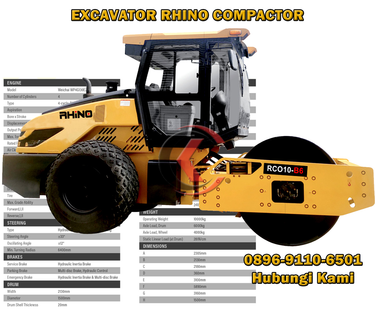 Excavator Rhino terkenal yang dikenal karena keandalan, daya tahan, dan efisiensinya dalam berbagai sektor konstruksi, sektor pertambangan, dan sektor kehutanan. Operating Weight : 10000 Kg, Drum Width : 2,13 m, Engine : WEICHAI WP4G130E22.