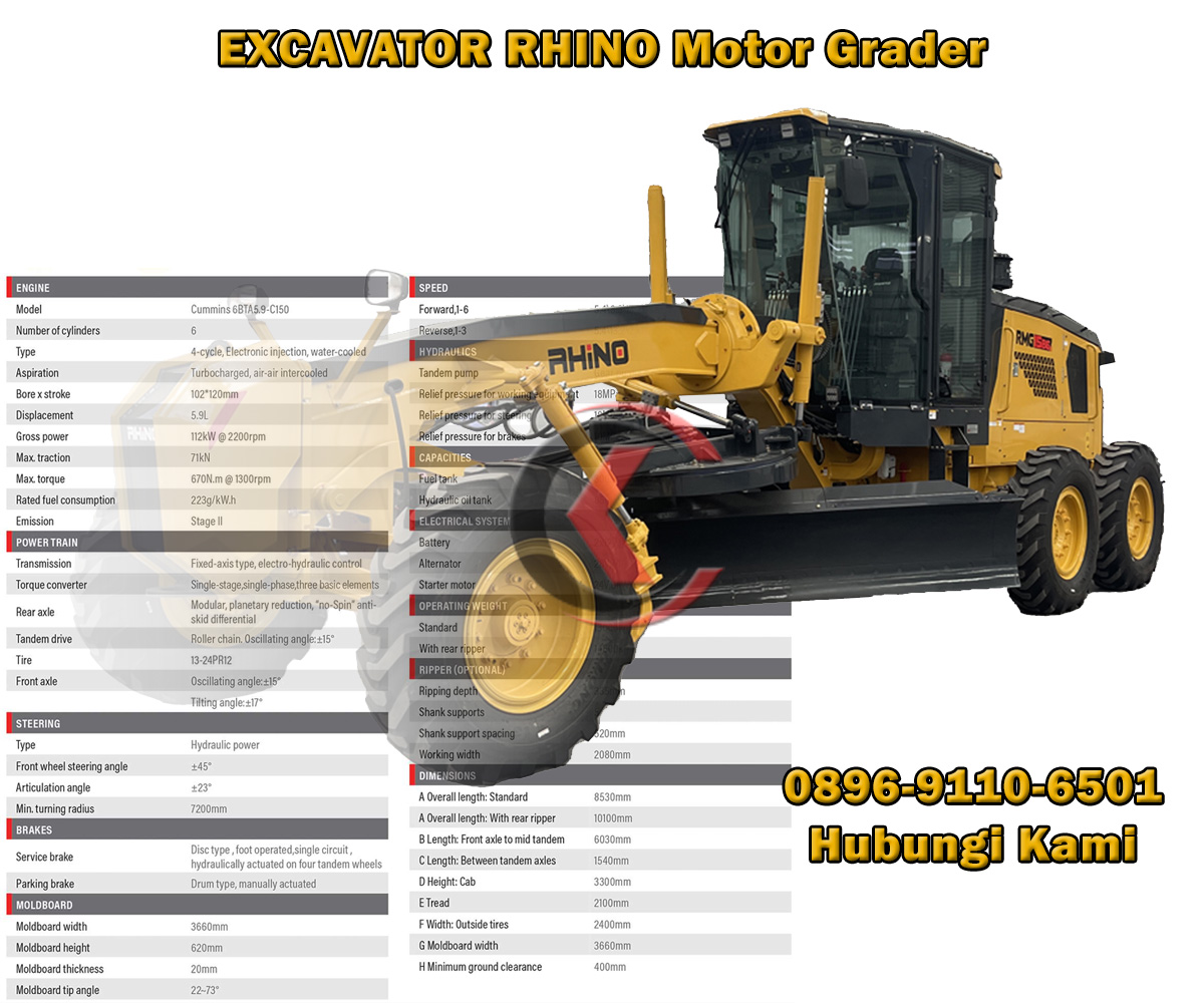 Excavator Rhino terkenal yang dikenal karena keandalan, daya tahan, dan efisiensinya dalam berbagai sektor konstruksi, sektor pertambangan, dan sektor kehutanan. Operating Weight : 13000 Kg, Moldboard Width : 3,66 m, Engine : CUMMINS 6BTA 5.9.