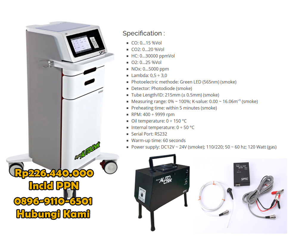 Autocheck Model LUX GP-20GN Gasoline Analyzer adalah alat uji emisi gas buang untuk berbahan bakar BENSIN/LPG/CNG dengan parameter ukur (CO, CO2, HC, O2, Nox, Lamda, atau AFR). Dengan tampilan layar TFT sentuh (touchscreen) memberikan kesan mewah dan memudahkan dalam pengoperasian.