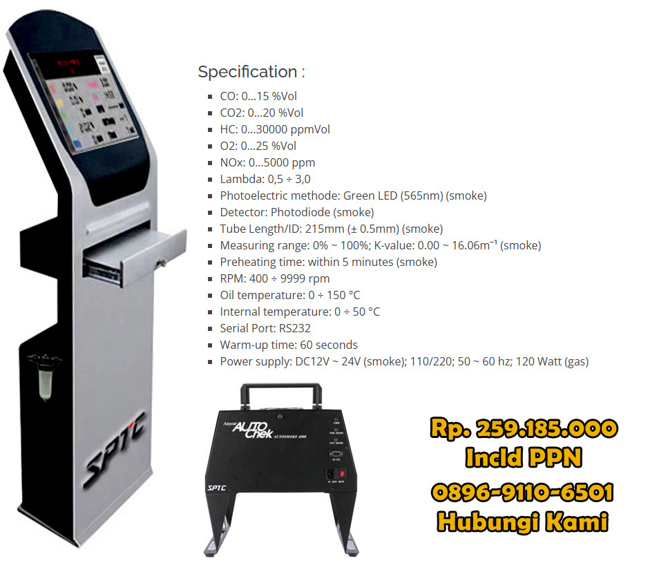 Autocheck Model KIOSK GP-20GN & GP-20S Smoke Opacity adalah kombinasi 2 (dua) alat yang dipadukan dalam satu sistem yang mengintegrasikan Gas (CO, CO2, HC, O2, Nox, Lamda, atau AFR) untuk mengukur gas buang kendaraan mobil Bensin atau LPG/CNG dan kendaraan DIESEL/SOLAR