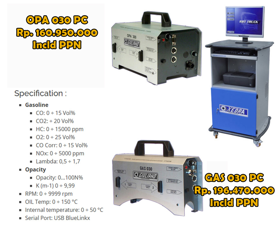 Giuliano Kombinasi Alat Uji Emisi Model GAS030 NDIR (Non Dispersive Infrared) dan OPA030, adalah alat untuk menganalisa gas buang dan pengukur kepekatan asap (Opacity) adalah versi biaya rendah dari berbagai model uji emisi kami